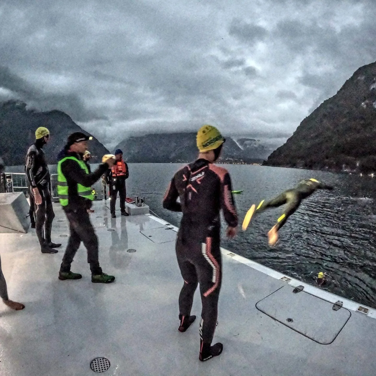 Det hela börjar med att man checkar in sin cykel kl.3 på natten för att sedan gå på en färja kl. 04.00 som tog oss 4 km ut i Hardangerfjorden. Därifrån fick vi starta loppet med det omtalade ”the jump”, då man hoppar av färjan ner i det mörka vattnet. Efter 10-15 min väntan i vattnet gick äntligen starten kl.5:00 och vi fick börja simma tillbaks in mot Eidfjord. Solen började äntligen gå upp då, men regn och moln gjorde att det var en mörk start.